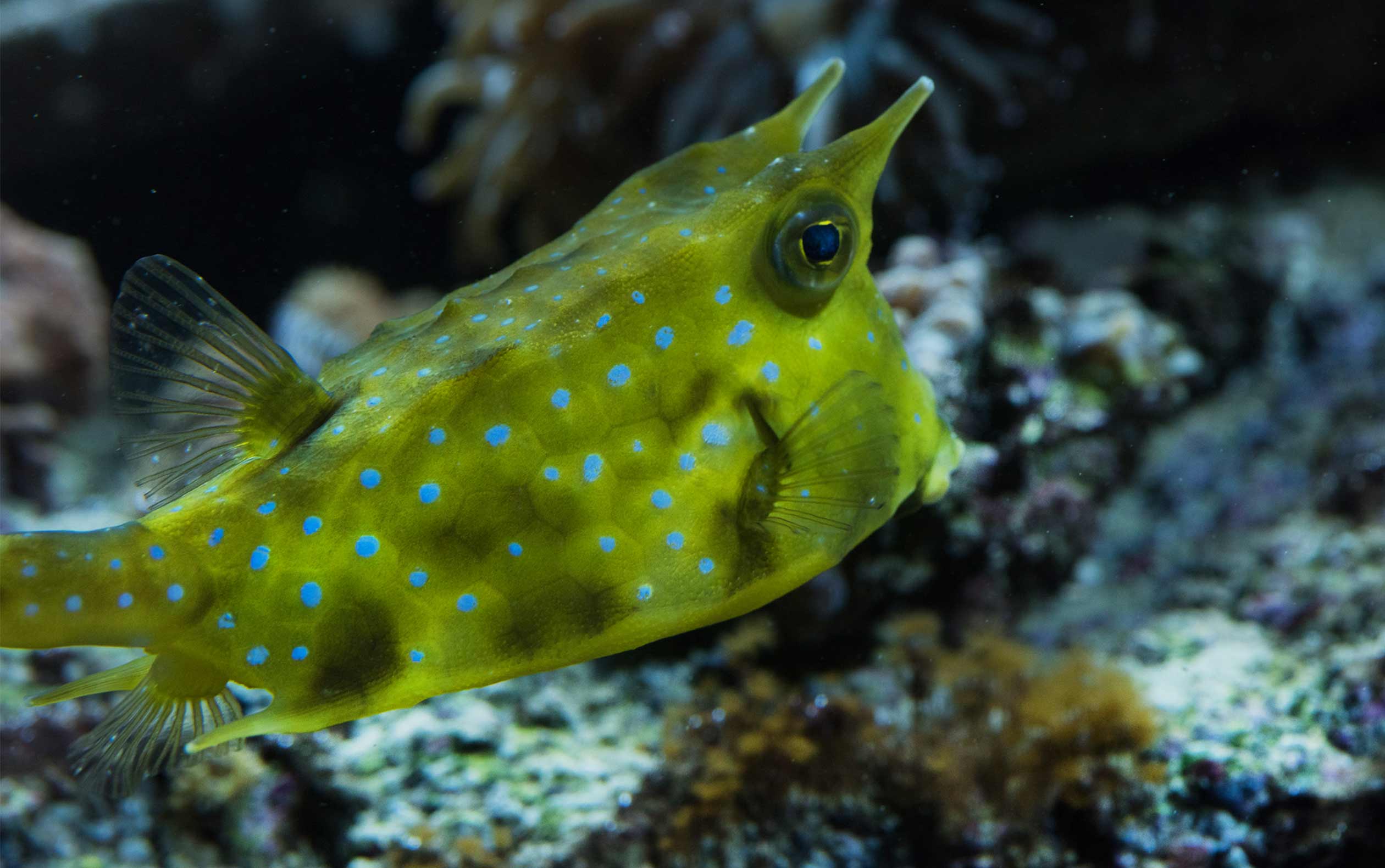 Le corps des poissons coffre est formé de plaques osseuses soudées, ce qui leur confère une forme de boîte caractéristique. Cette espèce possède en plus 2 cornes en avant de la tête, elle est aussi appelée poisson vache.